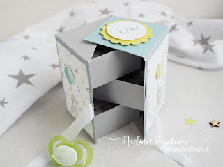 Ich habe für euch heute eine Geschenkebox zur Geburt gewerkelt. Diese Box ist wie ein kleiner Schrank gestaltet. Im Inneren befinden sich lauter Sachen, die man als frisch gebackene Mama gebrauchen kann. Das Designerpapier habe ich mit den Ministempel von beemybear gestaltet.